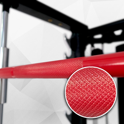 - Гриф в тренажере Смита ходит по прямым направляющим плавно и без рывков. Для удобного хвата на гриф нанесены антискользящие насечки. Толщина втулок стандартная — 50 мм.