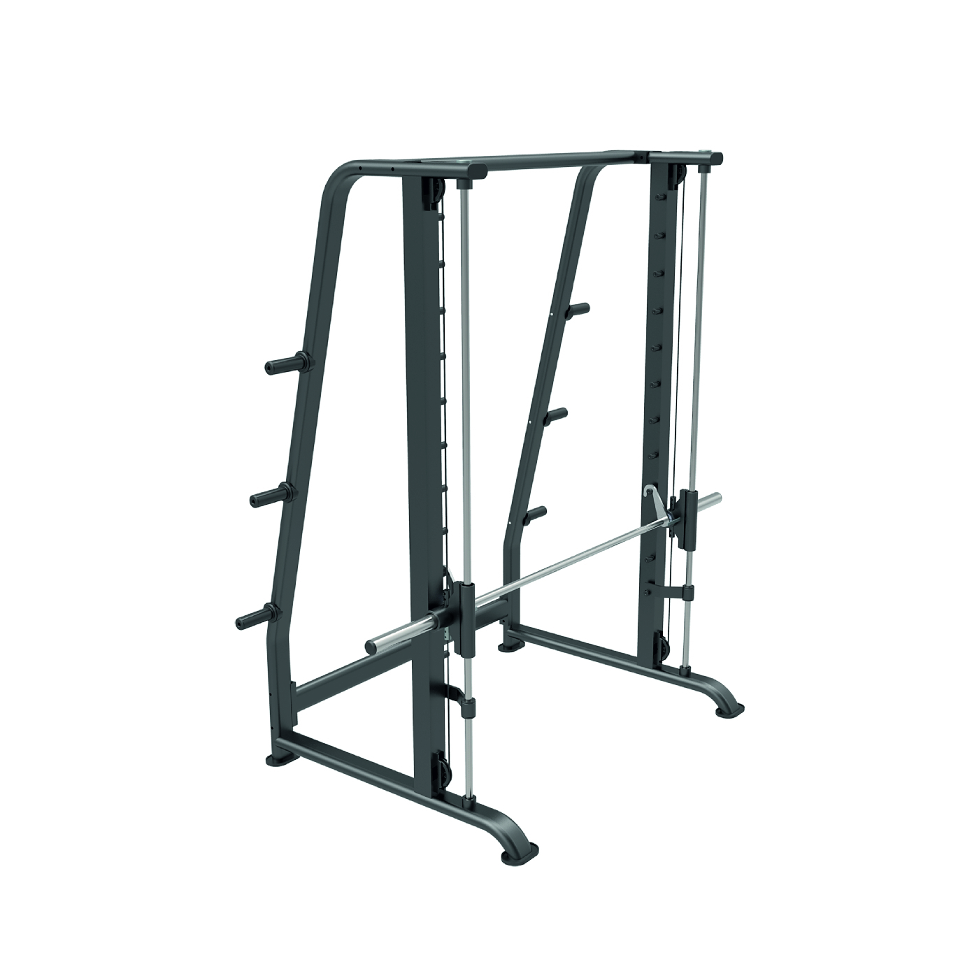 Он представляет собой П-образную силовую раму с прямым грифом, который свободно двигается внутри стоек и страховочных крюков для безопасности выполнения упражнений.