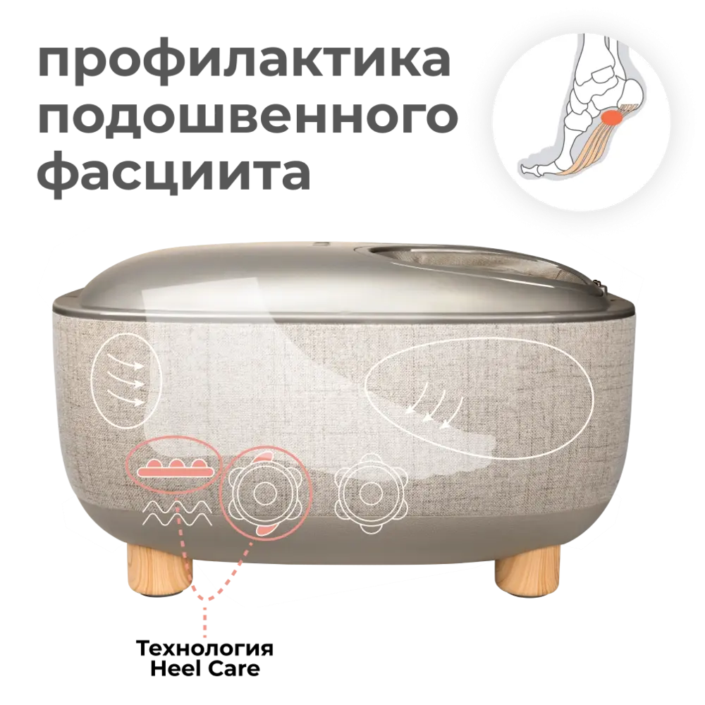 Функция Heel Care осуществляет комплексное воздействие на ахиллово сухожилие и подошвенные фасции, улучшая эластичность связок и работоспособность мышц стопы, снимая боль и судороги в области пяток, ускоряя движение лимфы и кровотока, тем самым улучшая снабжение тканей питательными веществами и кислородом.