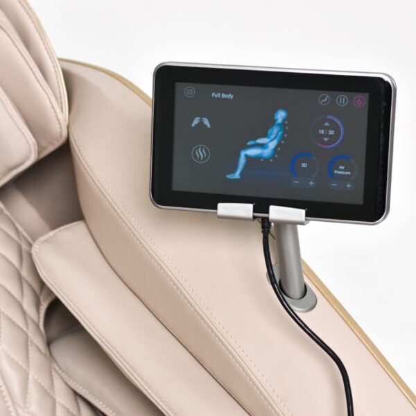 Есть прогрев ног, скорость роликового массажа стоп можно отрегулировать под ваши предпочтения. Управлять массажными программами можно с помощью сенсорного планшетного пульта или кнопкой быстрого доступа на подлокотнике.