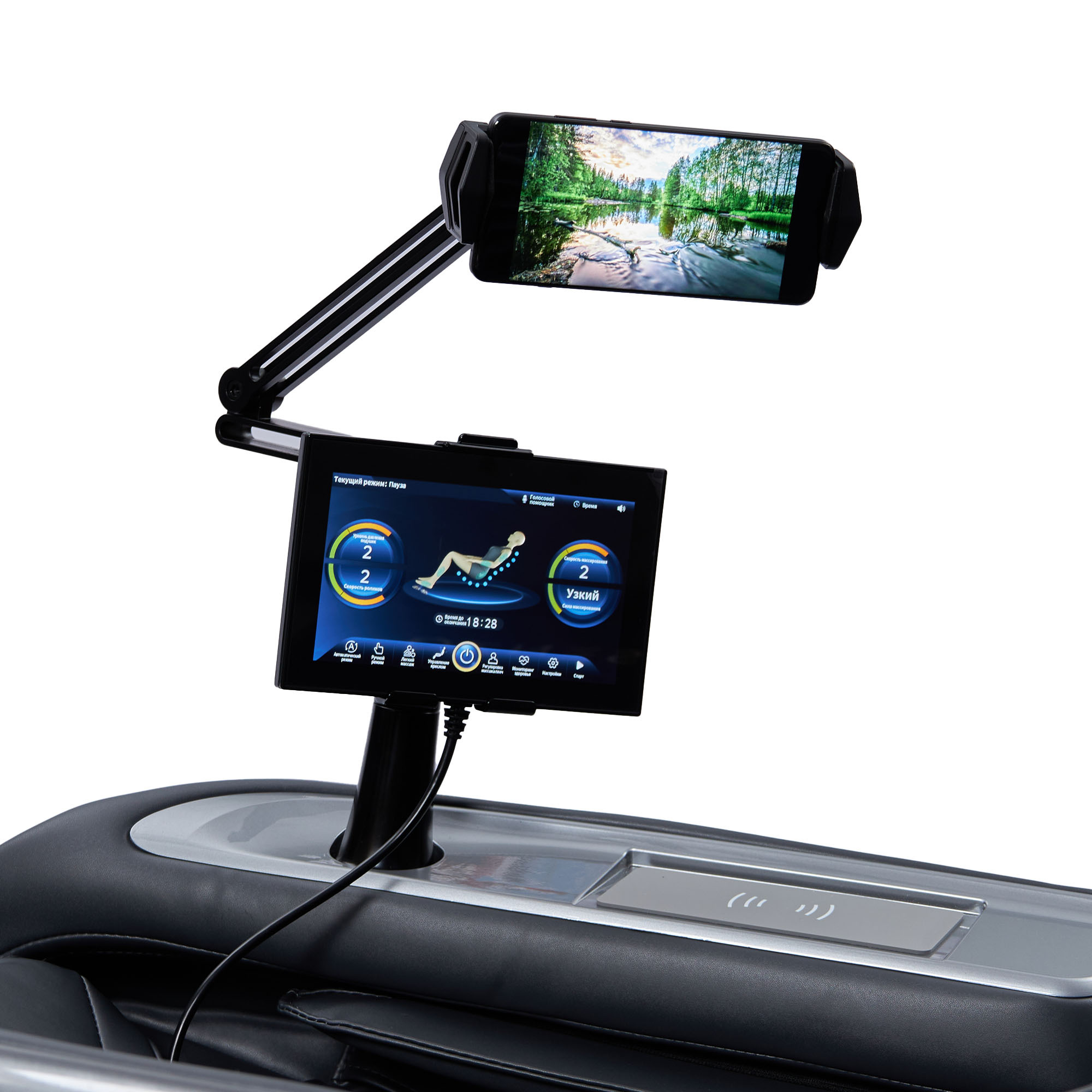 - В комплекте удобная подставка под телефон или планшет, которым можно управлять специальным джойстиком, встроенным в подлокотник, не отвлекаясь от массажа