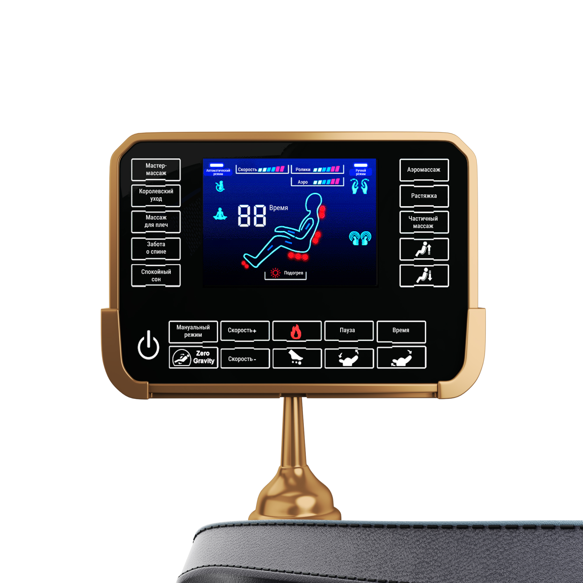 - Управляйте с легкостью! Интуитивно понятный LED дисплей позволяет легко управлять всеми функциями кресла. Вы сможете быстро выбрать нужную программу, регулировать интенсивность массажа и следить за временем сеанса. Яркие и четкие индикаторы делают использование кресла простым и удобным для любого пользователя. С помощью встроенного LED дисплея вы сможете также настроить положение спинки, отрегулировать подъем голеней, а также отрегулировать угол наклона кресла в режиме Zero Gravity, который помогает дополнительно снять усталость с мышц и улучшить кровообращение за счет имитации состояния невесомости. Функция памяти для двух пользователей положения массажера для плеч, интенсивности массажа, положение массажера для икроножных мышц и прочие данные о режиме массажа. При необходимости в меню можно настроить подогрев, роликовые массажеры, яркость экрана, время, язык и отображение состояния. Широкий диапазон изменения уровня давления и времени поможет настроить массажный механизм под свои потребности