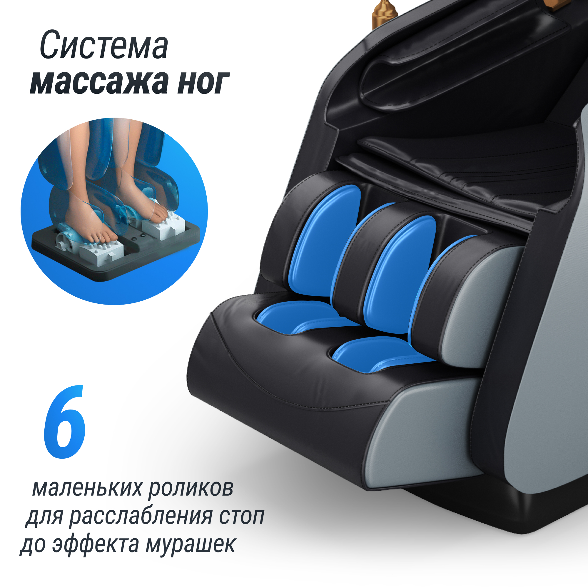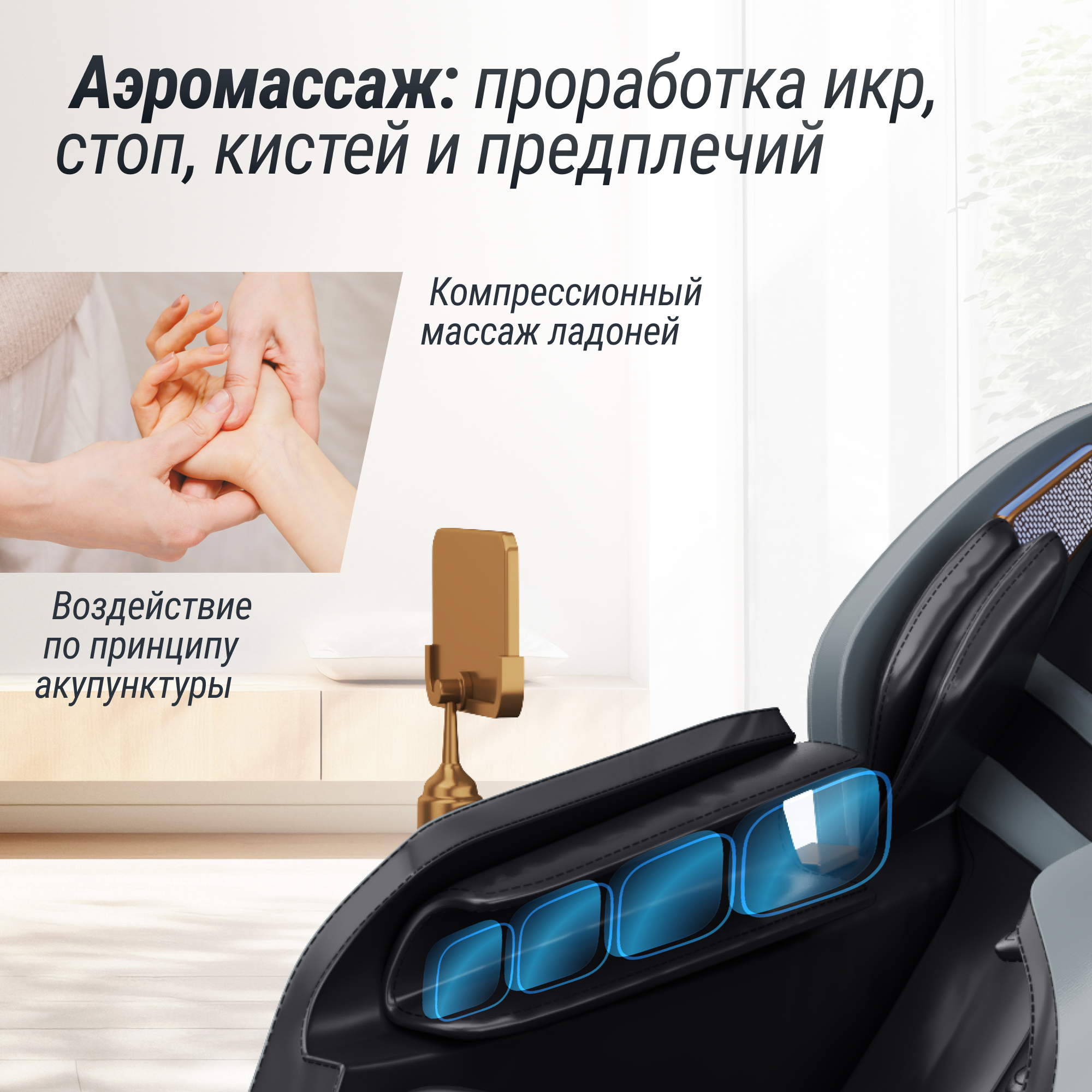 Воздушные массажеры для ладоней оснащены функциями ударного массажа и магнитной терапии. Кресло для массажа включает в себя роликовый массажер для ног, который массирует пальцы, ступни, а также своды ступней. А функция подогрева спины подарит дополнительный комфорт во время сеанса.