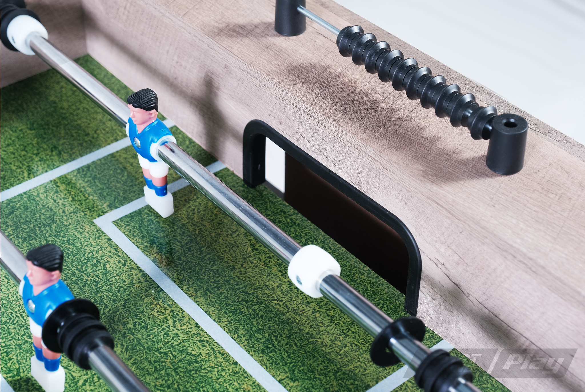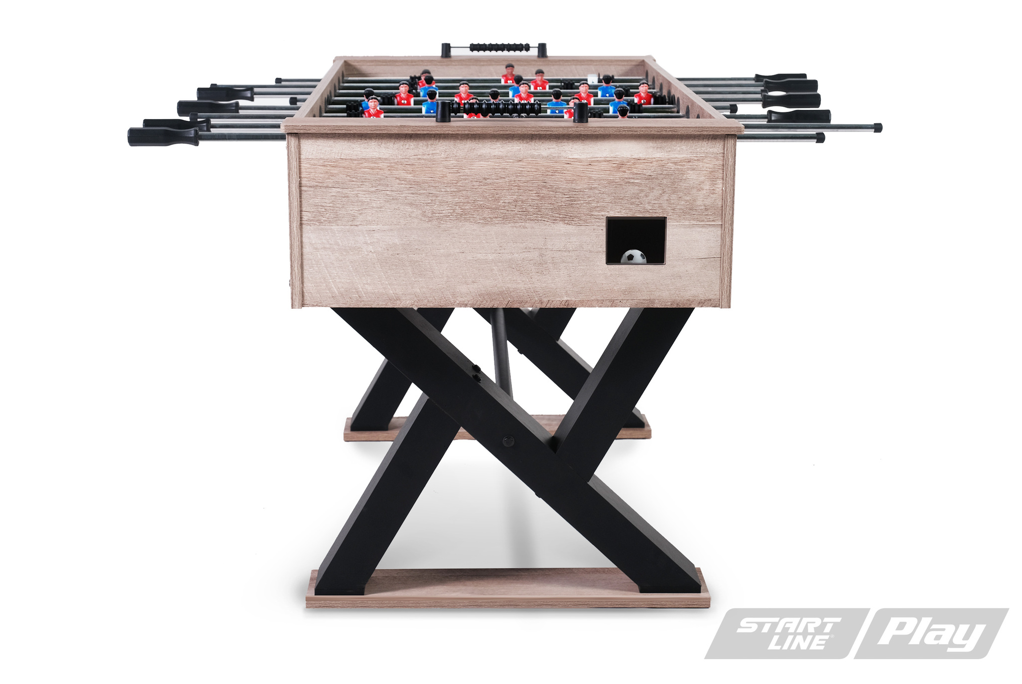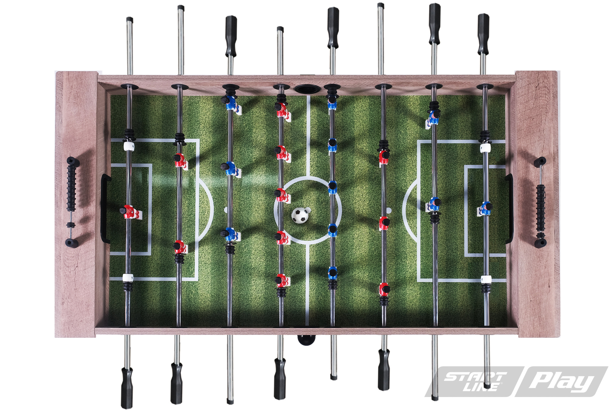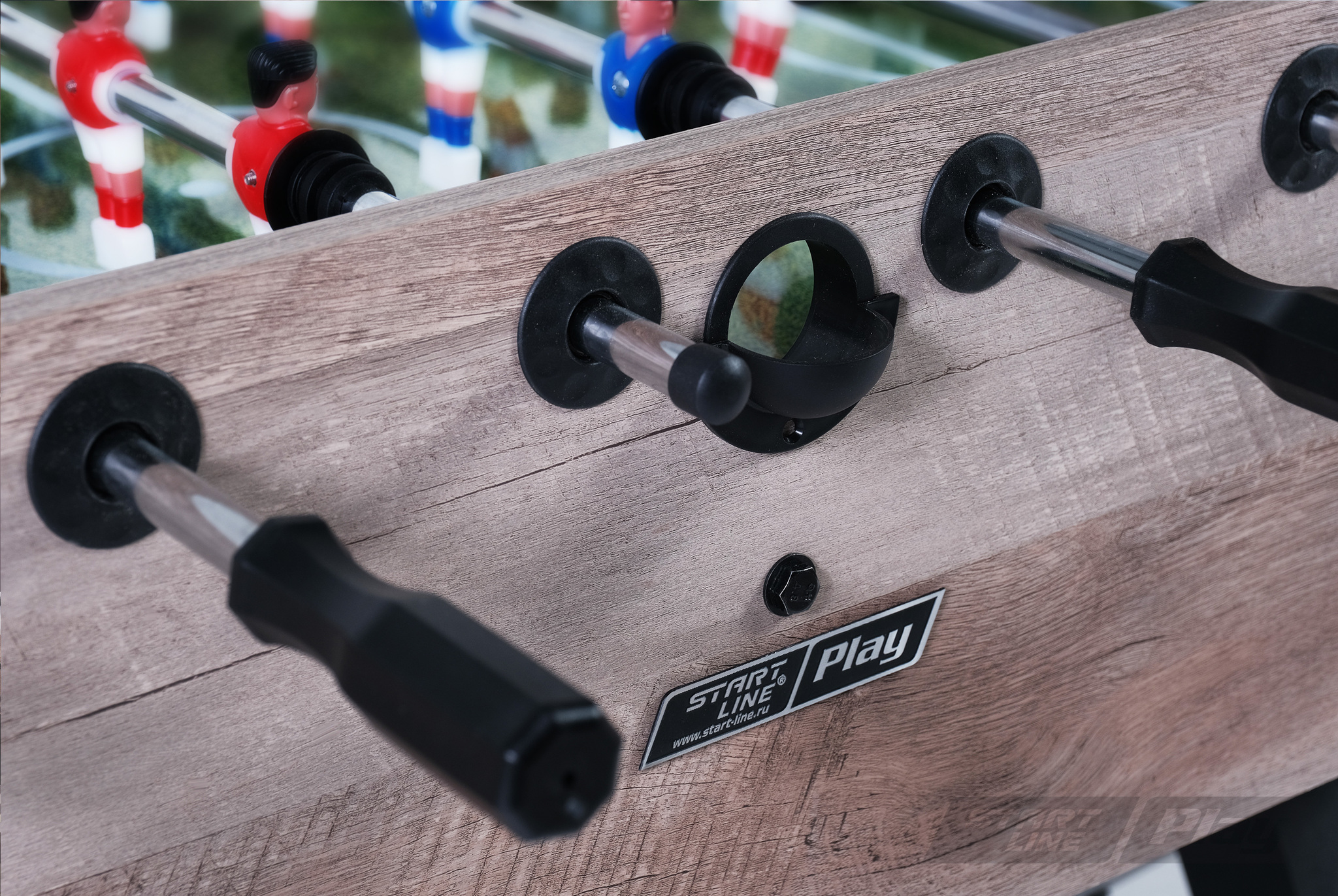 Sharp имеет прочную и устойчивую конструкцию, обеспечивая надежность даже при сильных нагрузках. Все элементы, включая отделку и фурнитуру, имеют качественное исполнение. Корпус, опоры и игровое поле стола выполнены из экологически безопасного МДФ. Стол оборудован механическими счетчиками для подсчета забитых голов и двумя мячами. Модель вобрала в себя массу преимуществ, среди которых: плавность хода и подвижность штанг, отсутствие искаженной траектории мяча, износостойкое игровое поле, удобные антискользящие держатели ручек.