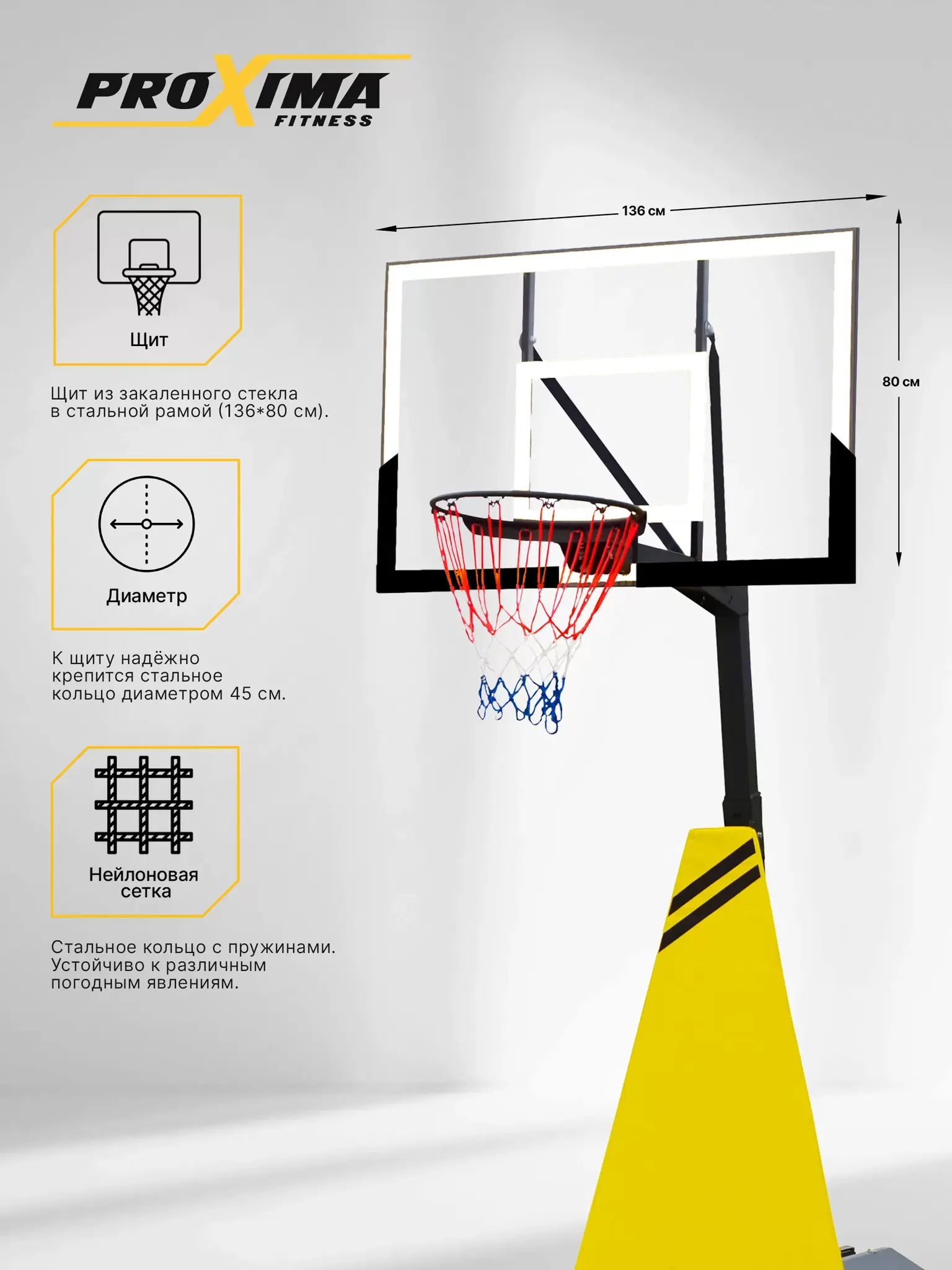 Щит из закаленного стекла создает отличный отскок мяча, а кольцо из прочной стали с вертикальной пружиной защищено от изгибов.