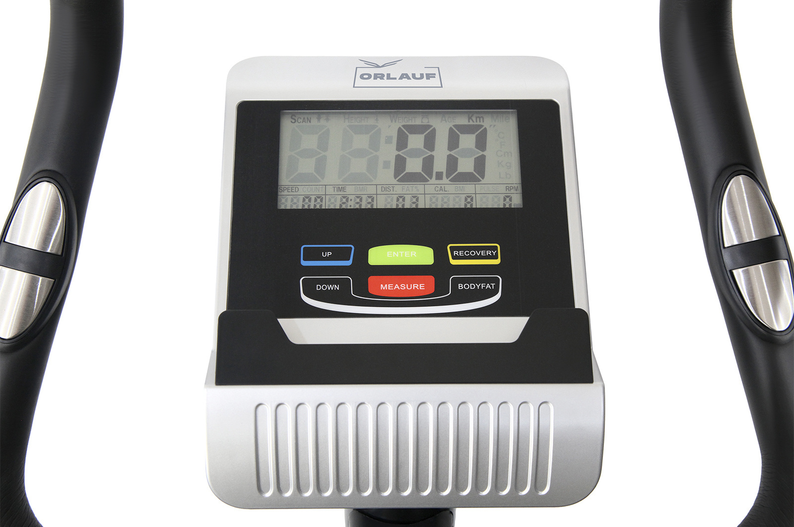 Консоль работает от батареек. На нее выводятся все показатели тренировки. Также есть функция жироанализатора, восстановления пульса и будильник. Сенсорные датчики пульса расположены на руле.