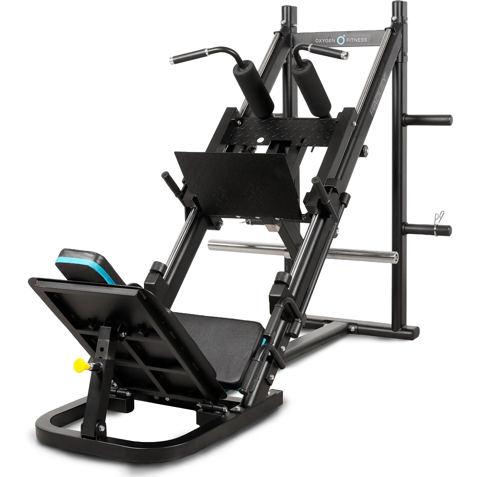 Тренажер предлагает выполнение двух основных упражнений: гакк и жим ногами под углом 45 градусов, что позволяет развивать силу и массу мышц ног. Эргономичное сиденье с наполнителем из PU поролона и обивкой из искусственной кожи обеспечивает комфорт во время тренировок, а 5 уровней регулировки спинки позволяют адаптировать тренажер под индивидуальные параметры пользователя. Жим ногами OXYGEN FITNESS HADLEY оснащен всем необходимым для эффективной тренировки.
