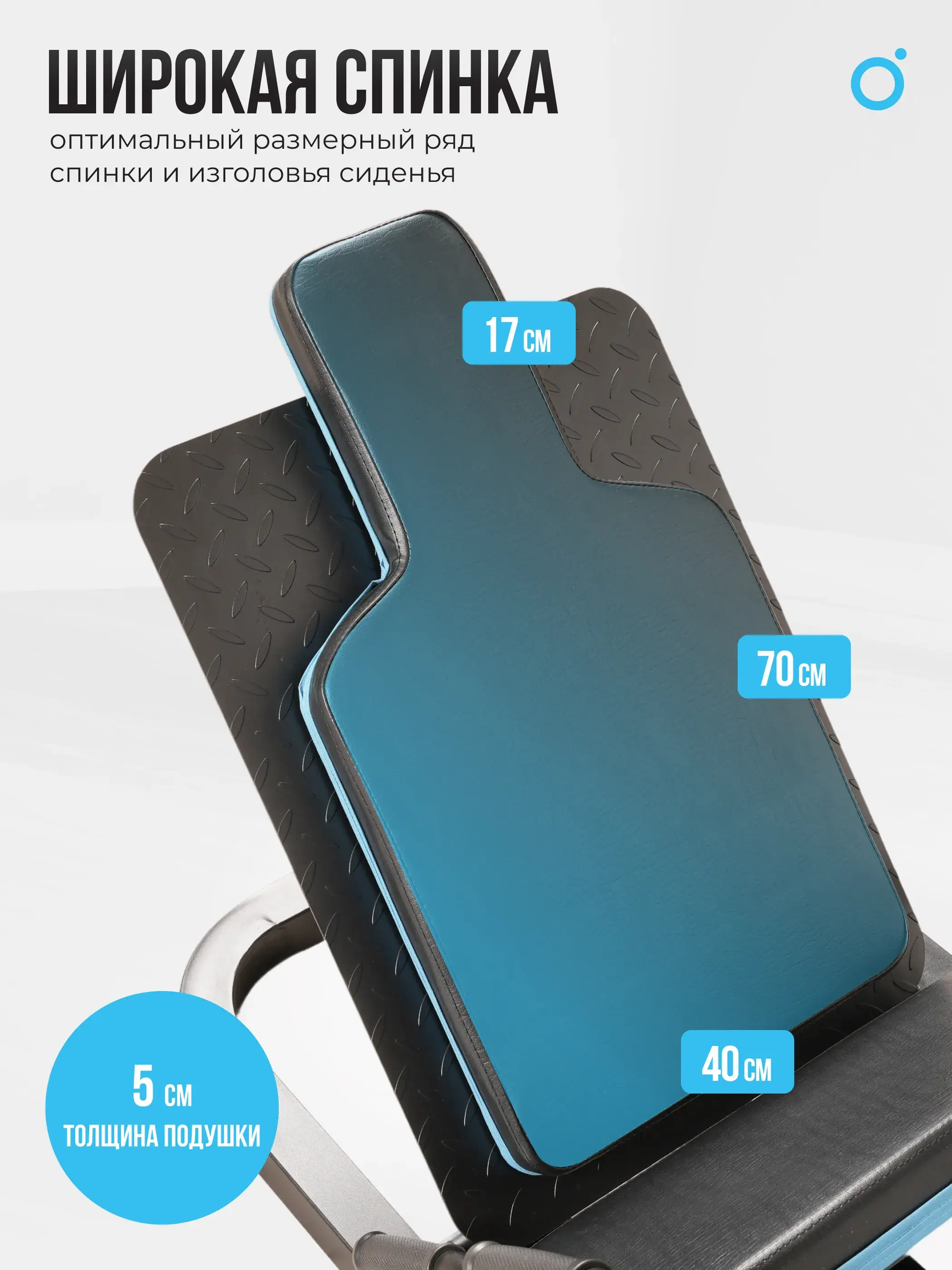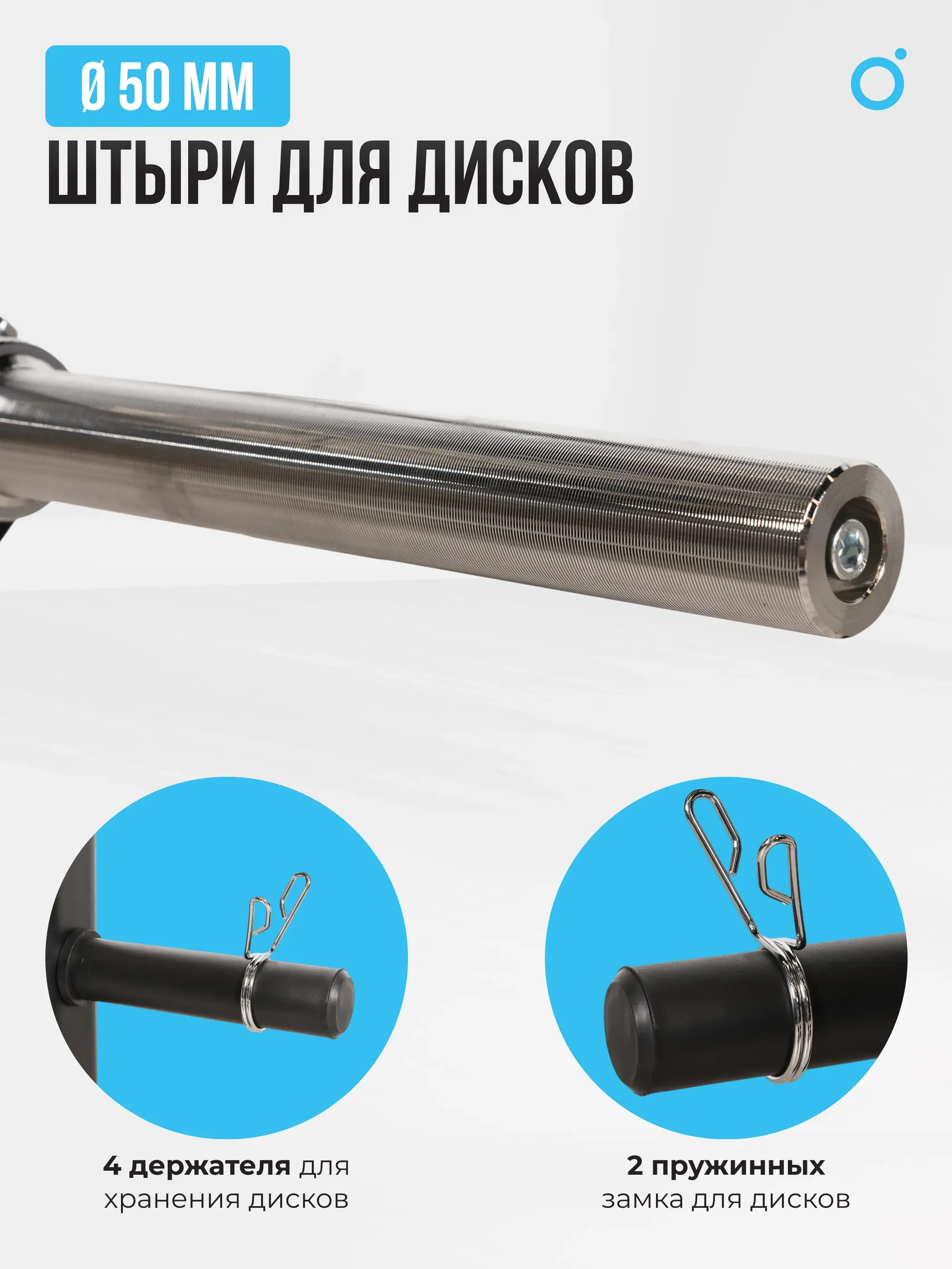 В комплект входят 4 штыря для дисков диаметром 50 мм и 2 замка для дисков, что обеспечивает надежную фиксацию веса. Ограничители и неопреновые валики добавляют дополнительный комфорт и безопасность во время тренировки. Спинка тренажера съемная и имеет размеры 70х40х17,5 см, а сиденье — 53,5х16,5х5 см, что позволяет легко настроить оборудование под свои параметры.