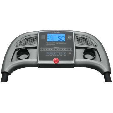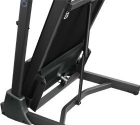 Тренировочный компьютер получил голубой многофункциональный LCD дисплей размером 5.2 дюйма (13.1 см.). В программный пакет входят 12 предустановленных программ, направленных на тренировку скоростных качеств, выносливости, укрепления сердечно-сосудистой системы и похудания. Помимо предустановленных программ, можно воспользоваться самостоятельно регулируемым ручным режимом, создать собственную программу в одном из 4-ех пользовательских режимов либо обратиться к одной из 2-ух пульсозависимых программ. К другим особенностям дорожки относятся гидравлическая система складывания easyFOLD™, которая существенно облегчает складывание дорожки, а при раскладывании обеспечивает медленное опускание полотна в последней фазе, гарантируя легкость и безопасность. На поручнях расположены сенсорные датчики пульса, а также “быстрые” кнопки изменения скорости. Мультимедиа представлена колонками мощностью 3 Ватта и входом Audio IN для воспроизведения аудио файлов от подключаемых СD либо MP3 проигрывателя. Перемещение дорожки происходит за счет 2-ух транспортировочных роликов. Выровнять положение тренажера относительно поверхности можно за счет компенсаторов неровностей пола.