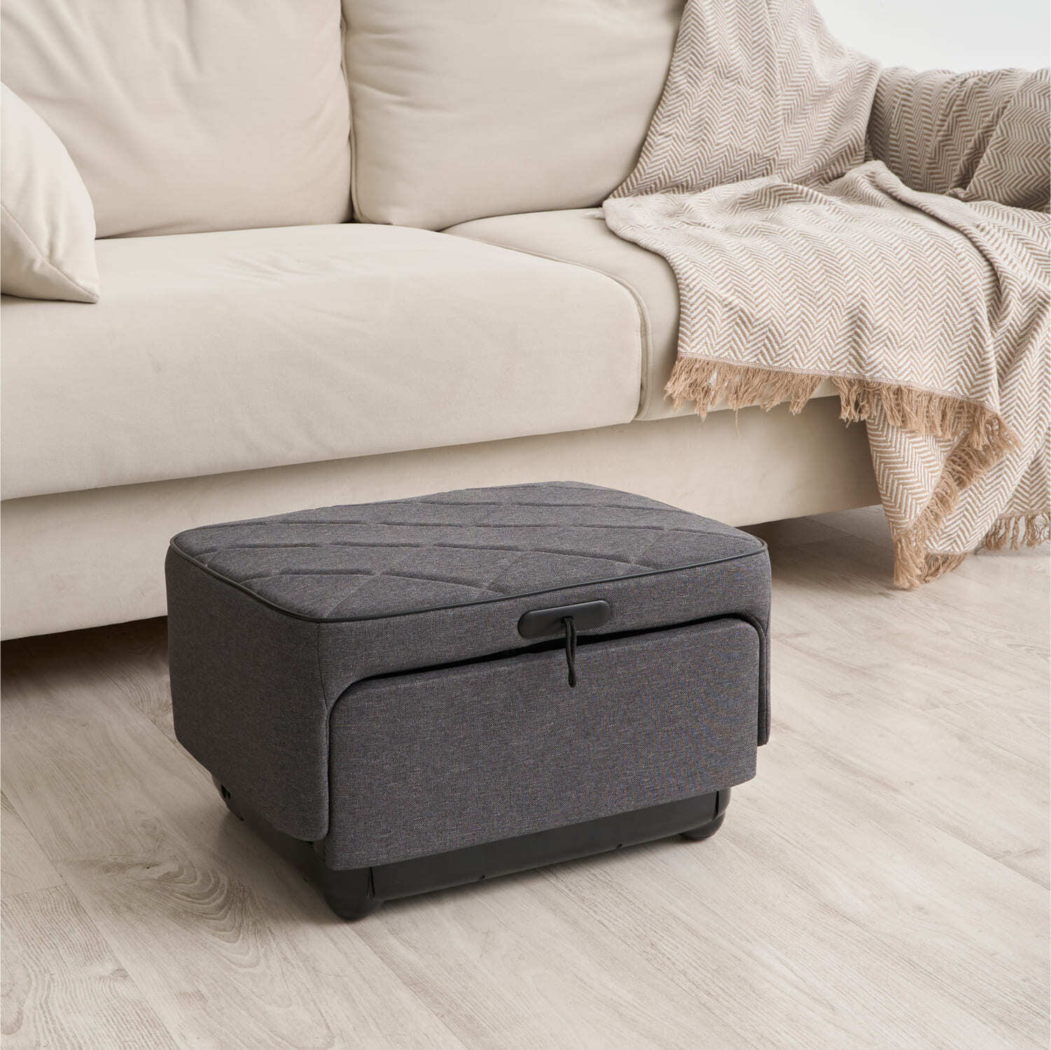 Массажер для ног в сложенном виде имеет уникальную форму пуфика, он не будет выделяться, его можно хранить на видном месте и использовать как отдельный предмет интерьера.