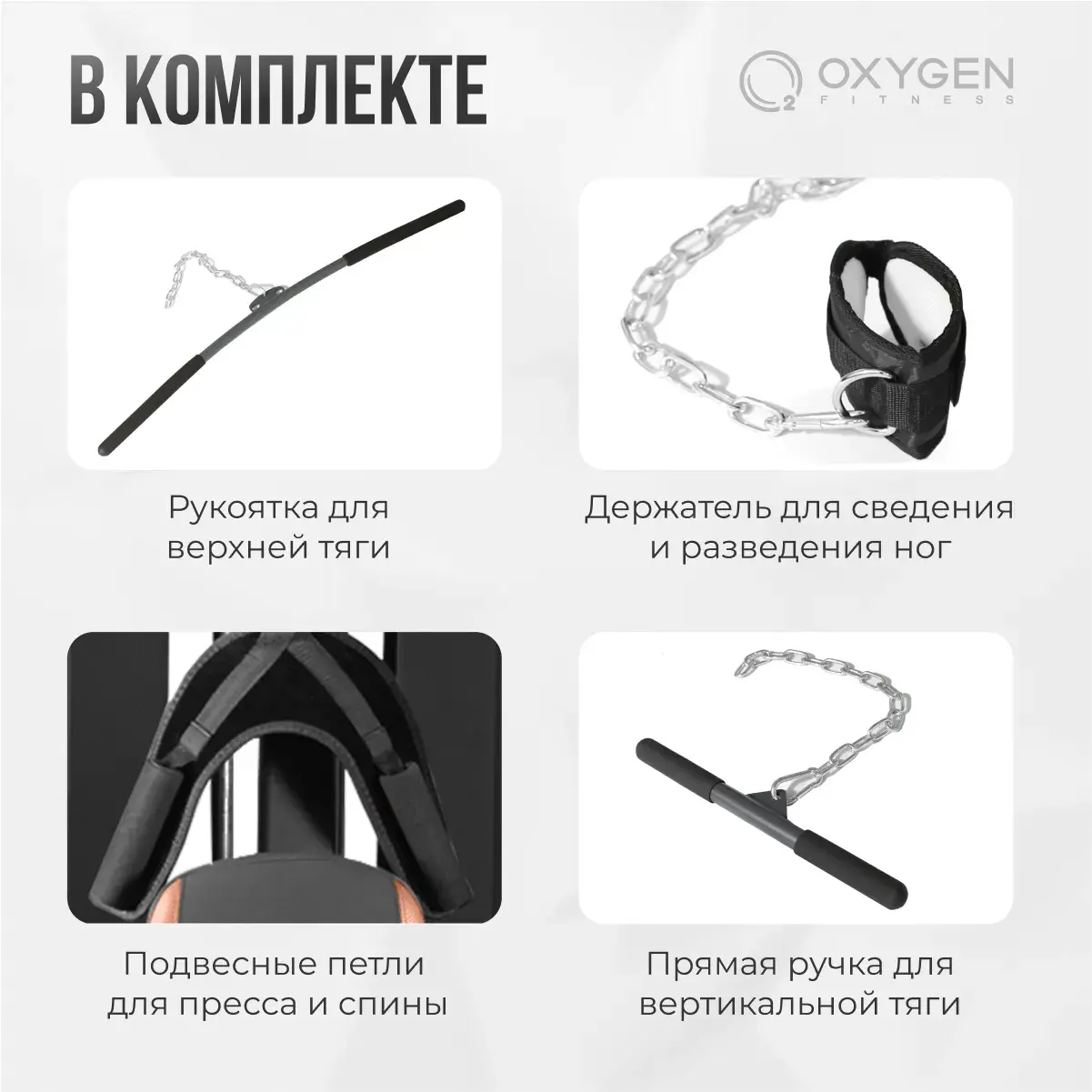 В комплекте предусмотрены: держатель для сведения и разведения ног, рукоятка для верхней тяги, прямая ручка для вертикальной тяги и подвесные петли для пресса и спины.