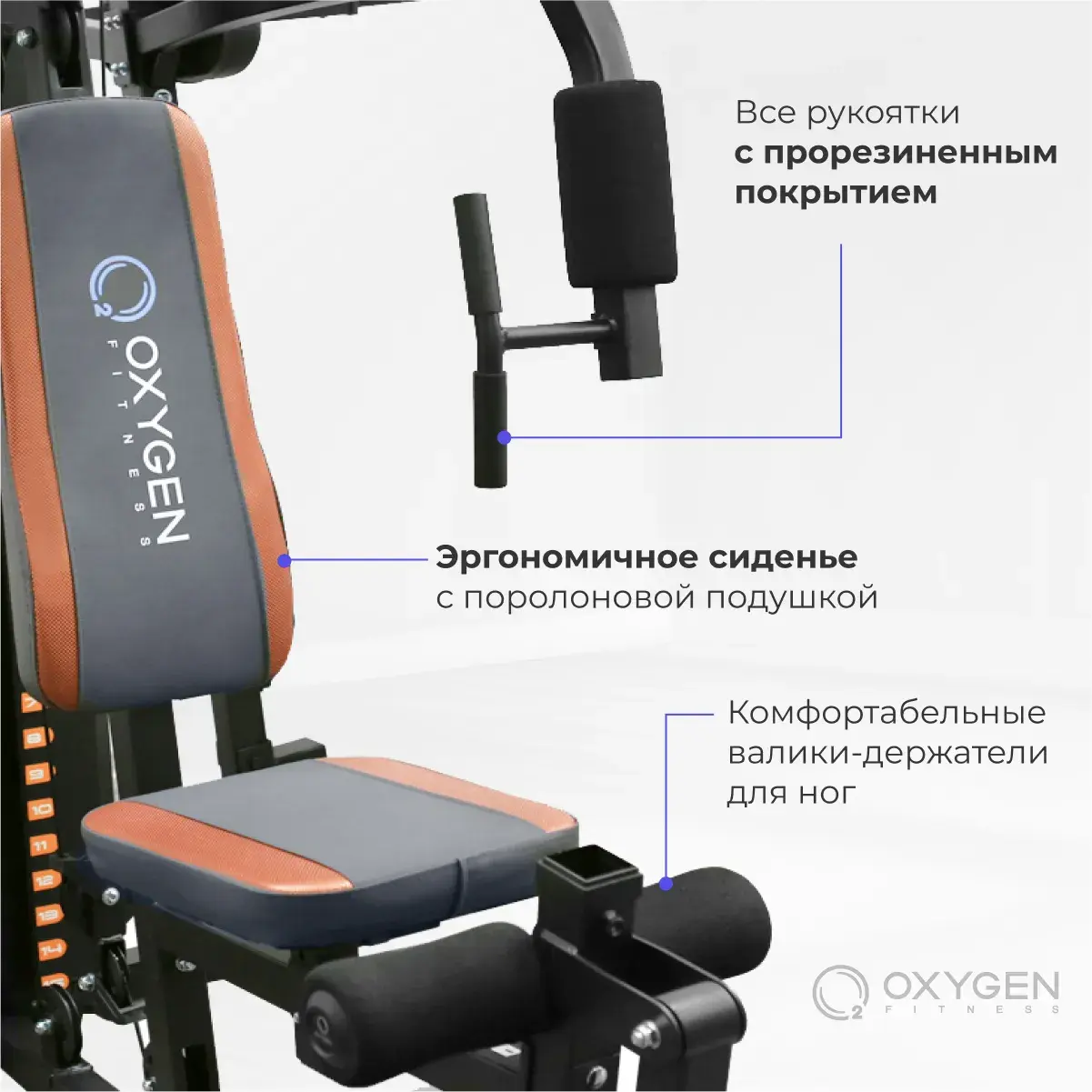 | Упражнения | жим от груди, жим от плеч, баттерфляй, верхняя и нижняя тяги, гребная тяга, пресс-спина, разгибание, отведение и приведение ног, бицепс |