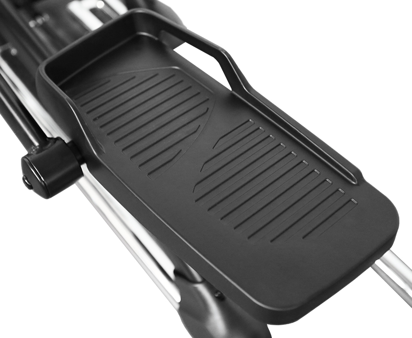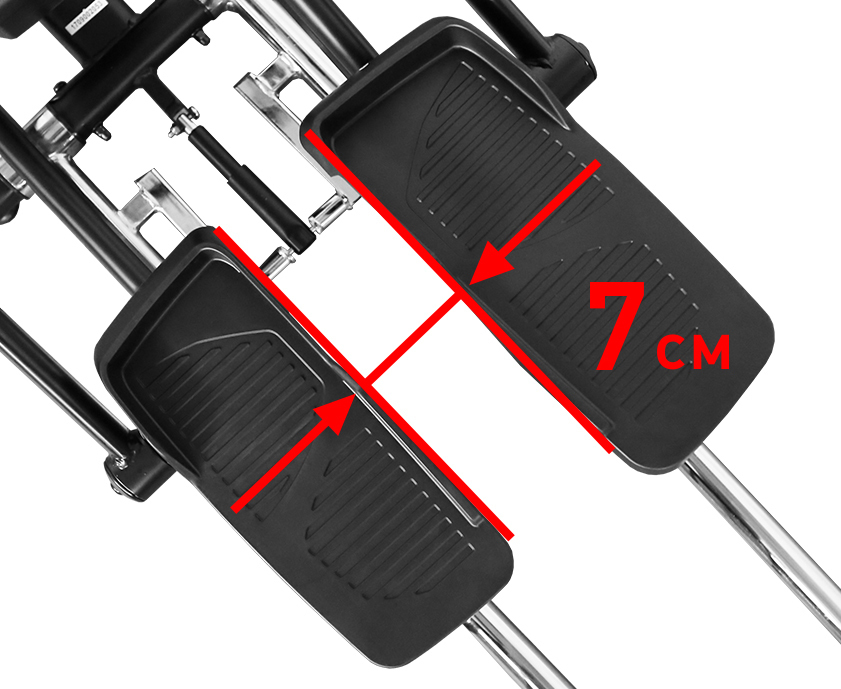 Если говорить о принципиальном отличии переднего привода от заднего, то это, в первую очередь, расстояние между педалями. У эллипсоида HEAVY G ELLIPTICAL такое расстояние составляет 7 см. Как известно, во время ходьбы расстояние между стопами обычно составляет 12-15 см, уменьшаясь во время бега до 8-10 см. Поскольку эллиптические тренажеры берут за основу беговые движения, расстояние между педалями также должно быть как можно меньше. Поэтому конструкция рамы и педального узла HEAVY G ELLIPTICAL обеспечивает минимальное расстояние между педалями (супермалый Q-фактор E.S.Q.F.). Таким образом, вектор силы находится под 90 градусов по отношению к осям - это оптимальное положение с точки зрения эффективности и безопасности тренировки. Безусловно, одним из важнейших биомеханических параметров является также длина шага - для HEAVY G ELLIPTICAL она составляет оптимальные 50 см.