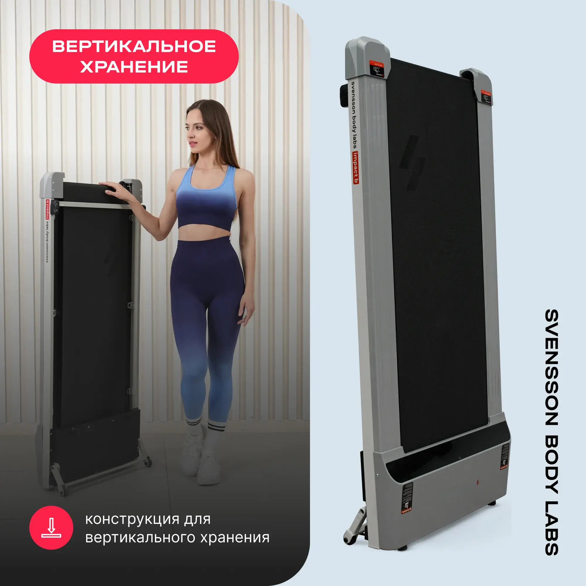 IMPACT B сочетает компактность, функциональность и готовность к использованию прямо из коробки. Вес тренажера составляет всего 25,2 кг, а его размеры составляют 137х60х15 см, что позволяет хранить дорожку в вертикальном положении у стены. При этом дорожка выдерживает максимальный вес пользователя до 100 кг, что делает ее универсальным решением для всей семьи.