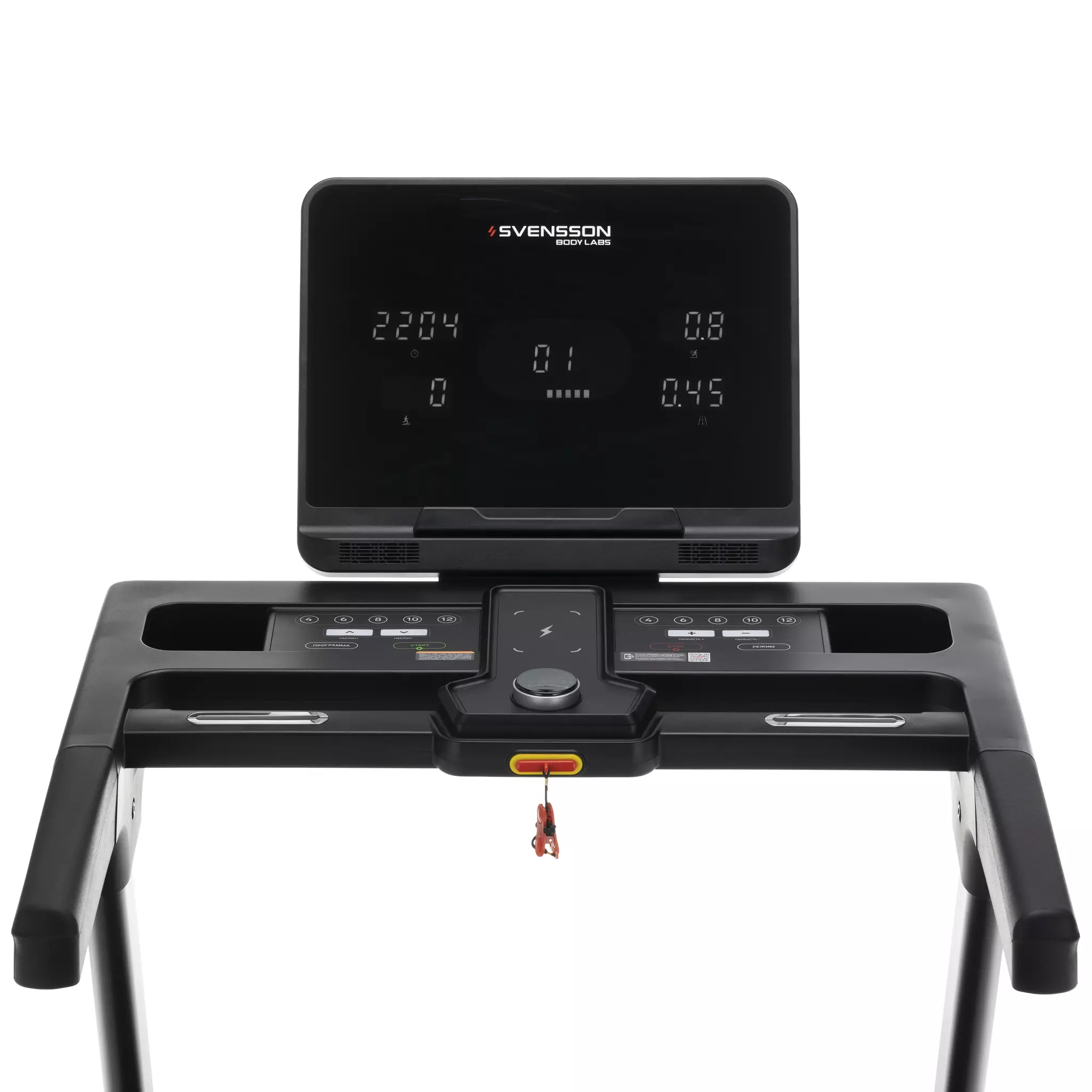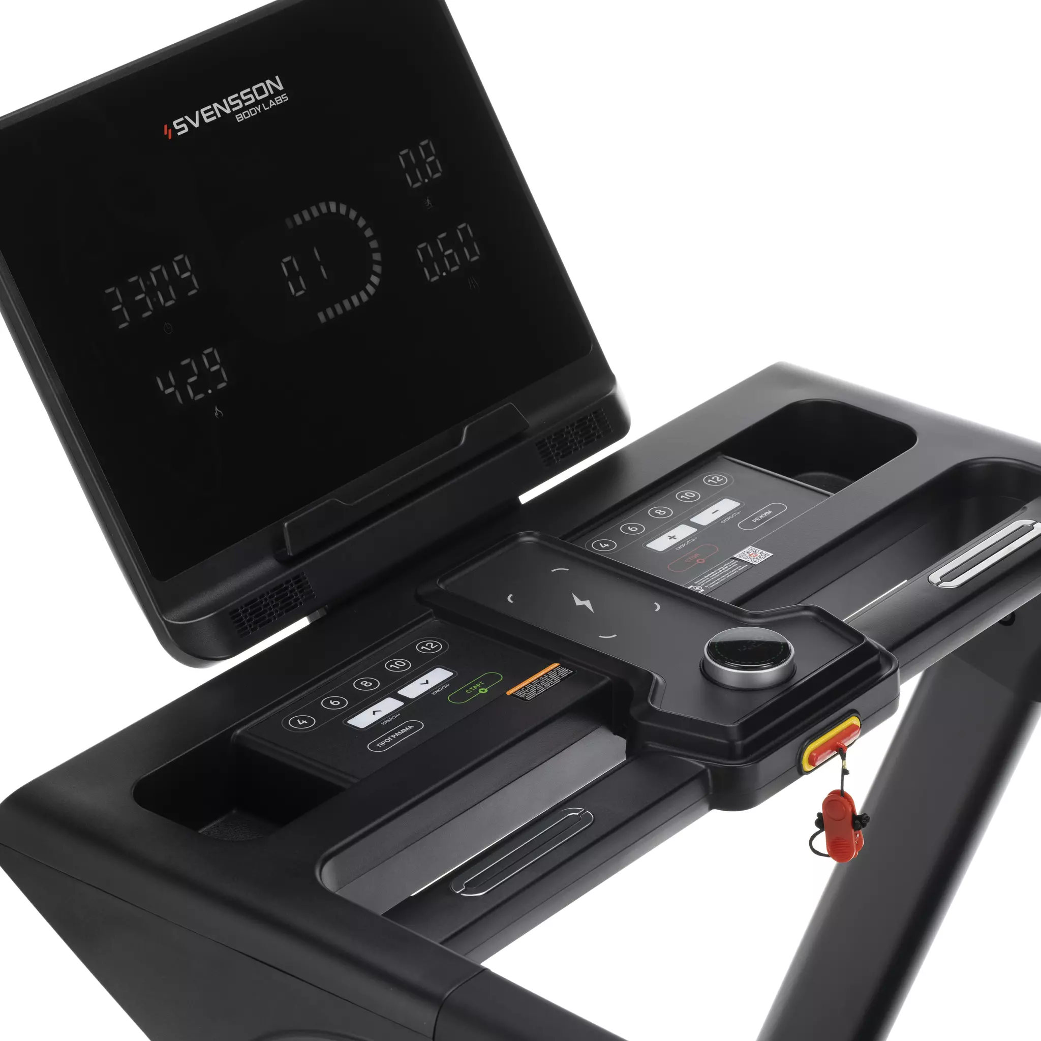 Шестизональный LED-дисплей с белой индикацией и многофункциональный дисплей шайба диаметром 61 мм отображают показания, такие как время, скорость, дистанция, уровень наклона, калории, пульс, шаги, жироанализатор (Body-Fat), профиль программы и статус Bluetooth. Всего доступно 19 программ тренировок, включая ручной режим, жироанализатор, встроенные, пользовательские и пульсозависимые программы.