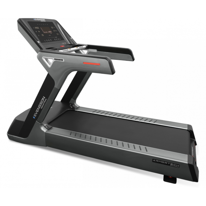Технические характеристики Svensson Industrial Armortechполностью соответствуют самым тяжелым режимам эксплуатации в формате 24x7. Двигатель японской Fuji выдает мощность 5.5 л.с. переменного тока (AC) в режиме постоянной эксплуатации и 8.6 л.с. в пиковой. Максимальная скорость движения составляет 23 км/ч, угол наклона - до 20%. Размер бегового полотна максимальный в классе: длина беговой зоны 165 см и ширина - 60 см. Новейшая амортизационная платформа buffer-Run™ построена на 4 пружинных группах и 2 эластомерах VCS™. Такая технология обладает великолепными демпфирующими свойствами и оказывает минимальную ударную нагрузку на колени, стопы и позвоночник. Максимальный вес пользователя для этой дорожки составляет 220 кг.