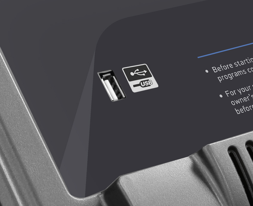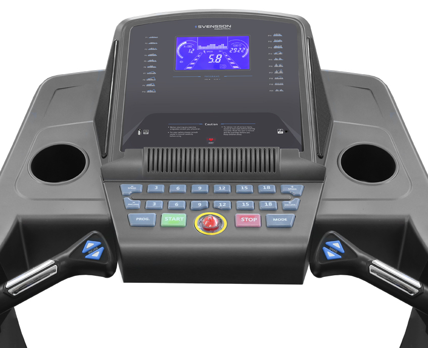 Тренировочный компьютер представлен голубым дисплеем диагональю 18 см с профилем тренировок. Встроенные программы ориентированы на любые возможные задачи - снижение веса, тренировку выносливости или скоростных качеств. Помимо предустановленных программ, можно воспользоваться самостоятельно регулируемым ручным режимом, а также создать собственную программу в одном из 3-х пользовательских режимов. 3 пульсозависимые программы отвечают за тренировку тех пользователей, которым важно контролировать верхние пределы частоты сердечного ритма. Для точного определения пульса и просто комфортной тренировки в компьютер встроен высокоточный беспроводной телеметрический приемник (для считывания частоты сердечного ритма рекомендован нагрудный ремень-передатчик Polar T34). Разнообразить тренировку поможет мультимедийная составляющая - в консоль дорожки установлены колонки мощностью 3 ватта, а носителями аудио файлов выступают MP3-плеер, смартфон или USB-накопитель. Рукоятки позволяют не только удобно и безопасно тренироваться, но и управлять базовыми параметрами - скоростью и углом наклона. Выровнять положение тренажера относительно поверхности можно за счет компенсаторов неровностей пола.