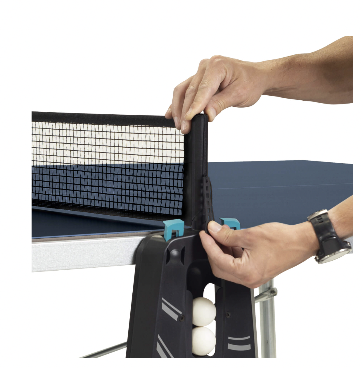 Сетка с регулировкой натяжения полотна и складными кронштейнами. Синтетическое полотно с возможностью регулировки натяжения нити долговечно и обладает высокой надежностью в условиях уличной эксплуатации. Выносные кронштейны обеспечивают игровой процесс в соответствии с регламентом ITTF и выполнены в складном форм-факторе. Одним движением можно минимизировать ширину стола за счет поворота кронштейна в горизонтальной плоскости.
