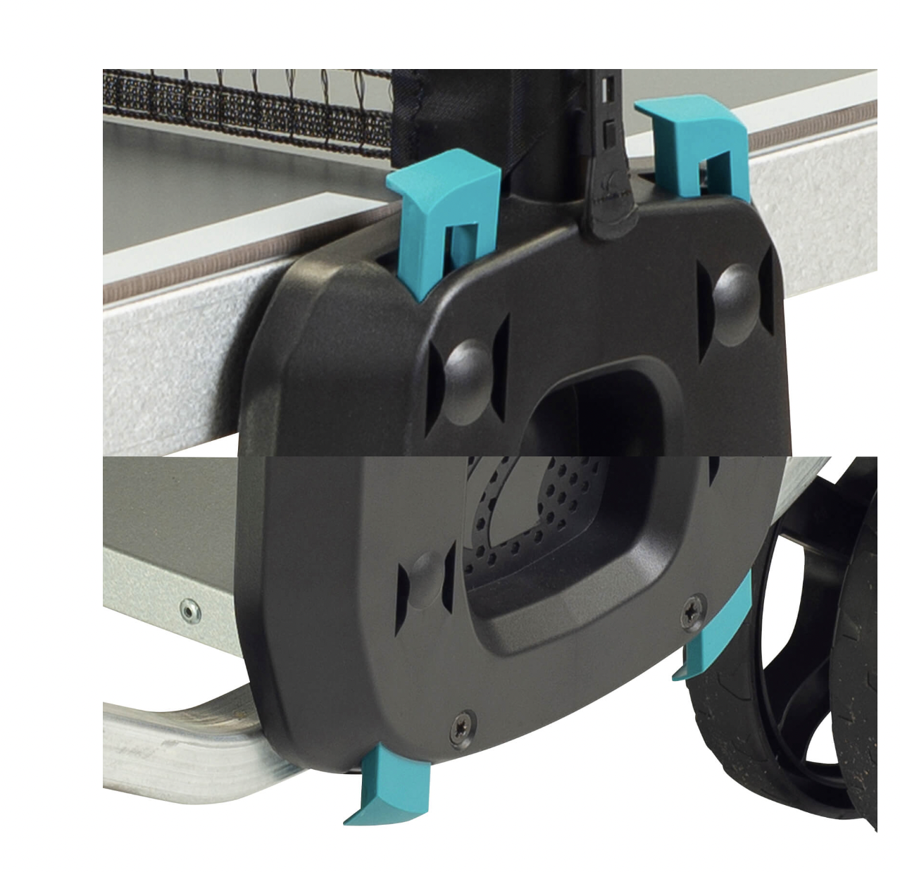 Тормозные механизмы для двух пар транспортировочных колес позволят надежно зафиксировать теннисный стол в рабочем и сложенном положении, снижая риск несанкционированного перемещения и сохраняя точные настройки рабочей позиции столешниц в горизонтальной плоскости (юстировка) в случае физических контактов игрока со столом, которые неизбежны во время увлекательного матча.