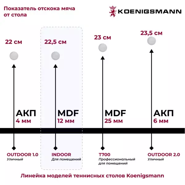 Кроме того, этот теннисный стол обладает высоким качеством игры. Благодаря показателю отскока 22,5 см, каждый удар будет точным и предсказуемым. Независимо от вашего уровня игры - начинающий или опытный любитель, вы будете получать максимальное удовольствие от игры на этом столе.