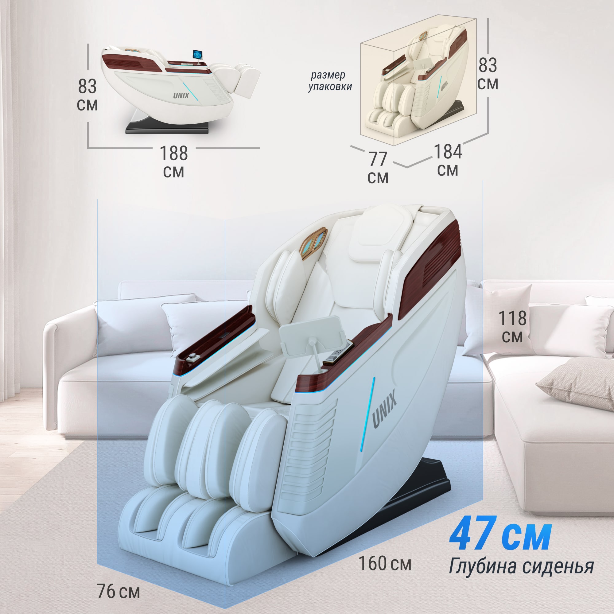 - ручной массаж / массаж голеней с возможностью регулировки интенсивности по трем степеням / Гуа-ша массаж корня стопы, свода стопы с регулировкой скорости по трем степеням в зависимости от ваших предпочтений / автоматическое обнаружение изгибов тела и массажных акупунктурных точек / автоматическое отключение манипуляторов / в подлокотнике расположен слот для беспроводной зарядки и порт Type-C