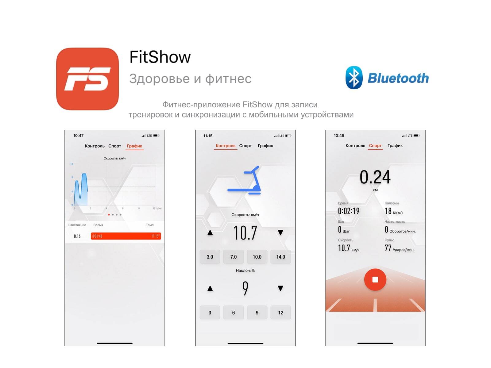 *Также, имеется возможность синхронизации беговой дорожки с мобильным устройством при помощи приложений FitShow (подключение через Bluetooth) с возможностью управления беговой дорожкой и сохранения тренировок.
