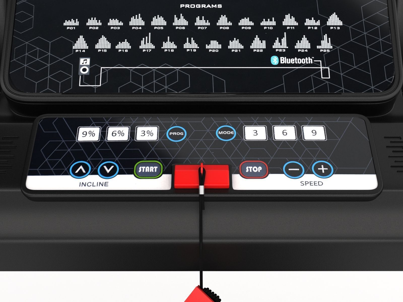 Беговая дорожка имеет опцию воспроизведения музыки (3 kW х 2 динамика) с подключением внешних устройств при помощи кабеля AUX, либо через Bluetooth.