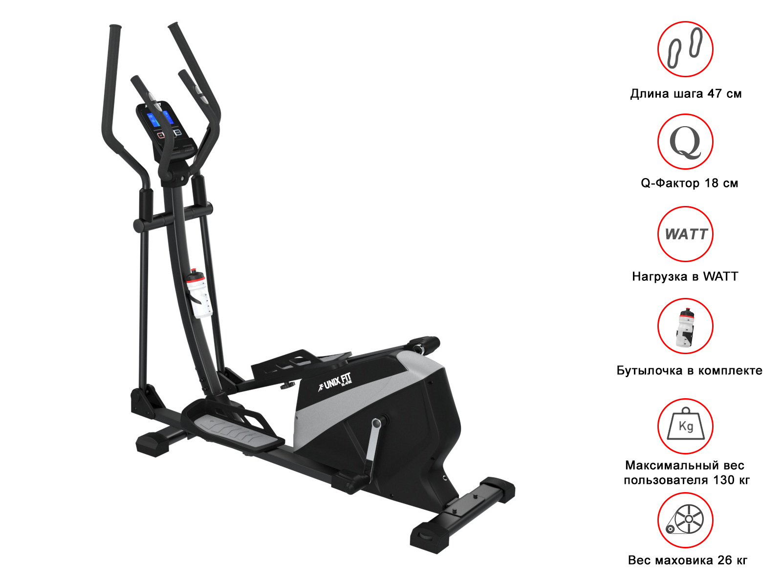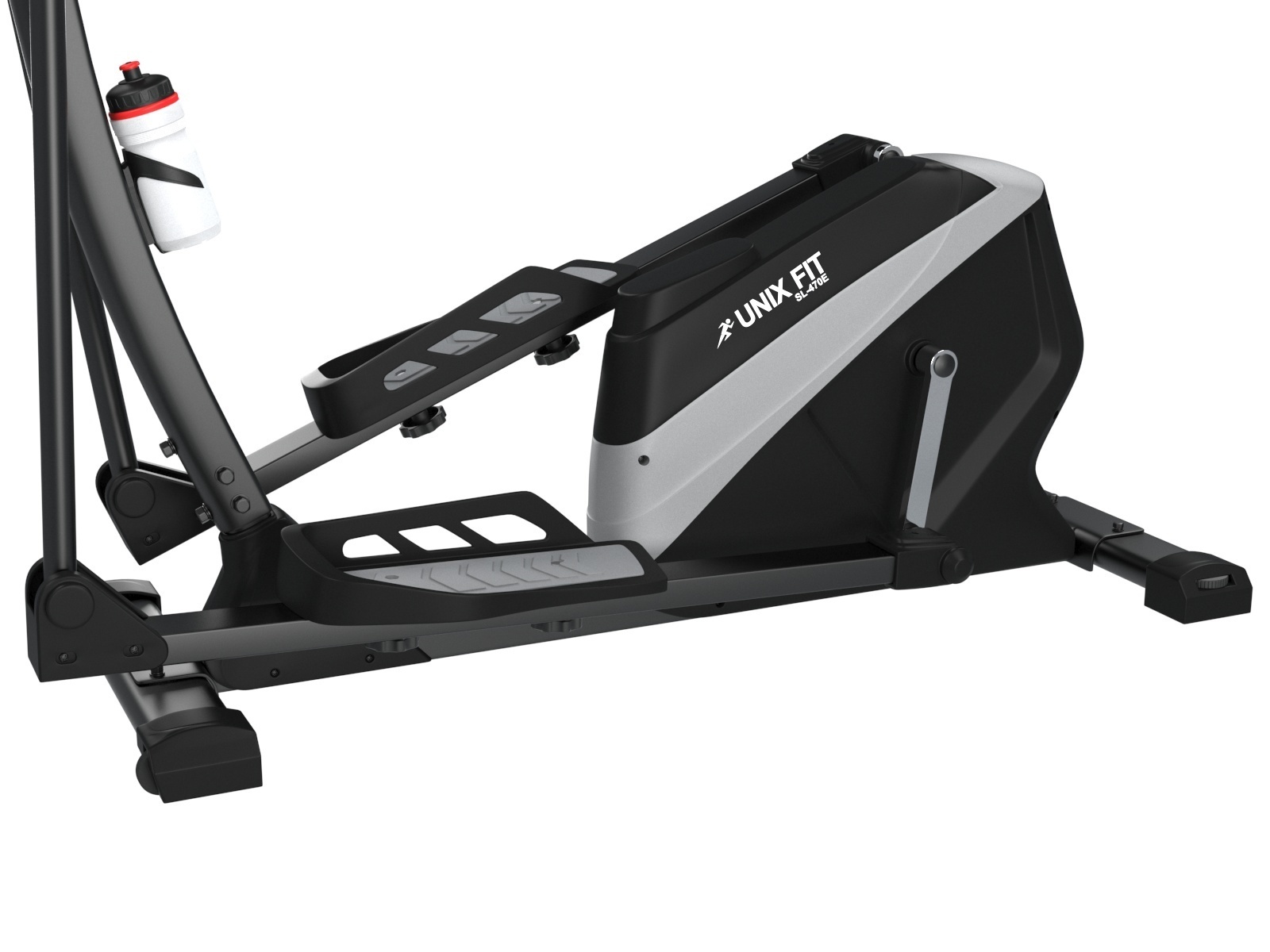 Электромагнитный эллиптический тренажер UNIXFIT SL-470E обладает усиленным трехкомпонентным педальным узлом и мощной рамой. Длина шага данной модели составляет 47 сантиметров, а расстояние между педалями (Q фактор) составляет всего 18 сантиметров.