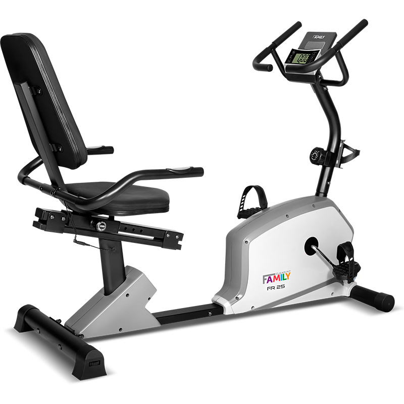 Горизонтальный велотренажер Family FR 25 для домашних кардио-тренировок без нагрузки на позвоночник. Удобное кресло с мягкой спинкой и регулировка сиденья по диагонали обеспечивают максимально комфортное размещение на тренажере, при этом вы получаете все основные плюсы велотренировки, без травм и ударной нагрузки: восстановление кардиоваскулярной системы, сжигание калорий, повышение выносливости и улучшение физической формы. Встроенные датчики пульса помогают контролировать самочувствие и поддерживать интенсивность на нужном уровне. Механическое изменение магнитной нагрузки позволяет легко изменять сопротивление поворотом вариатора - 8 уровней. Рекомендованный вес пользователя до 110 кг.