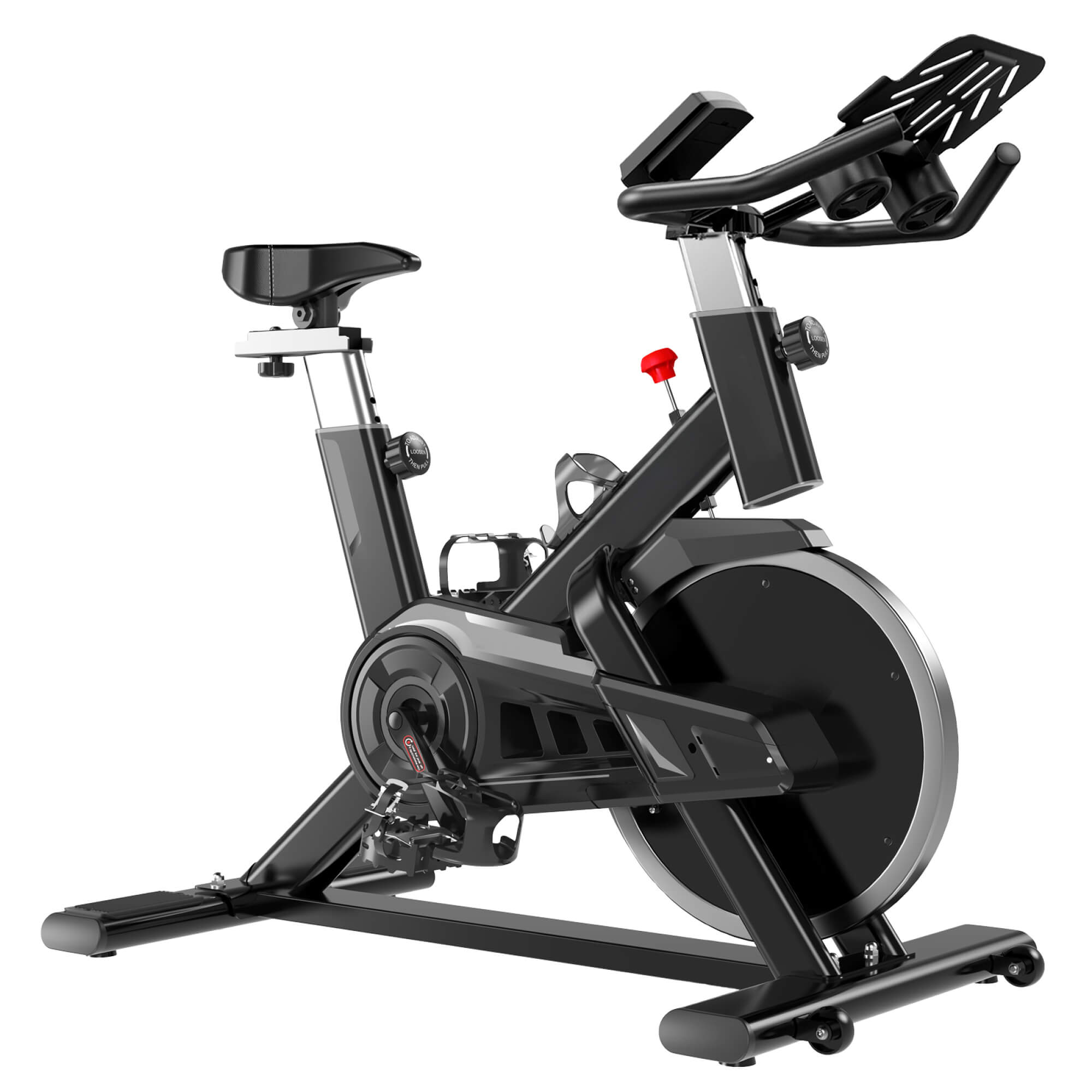 - Оснащение. Спортивная бутылочка с держателем обеспечивают дополнительное удобство при длительных кардио тренировках на тренажере. Встроенные компенсаторы неровности пола гарантируют устойчивость во время интенсивного тренинга. Резиновые ножки не позволят испортить напольное покрытие, даже при длительном интенсивном использовании тренажёра на одном месте. Специальные транспортировочные ролики позволят без труда перемещать спин байк по квартире и дому.
