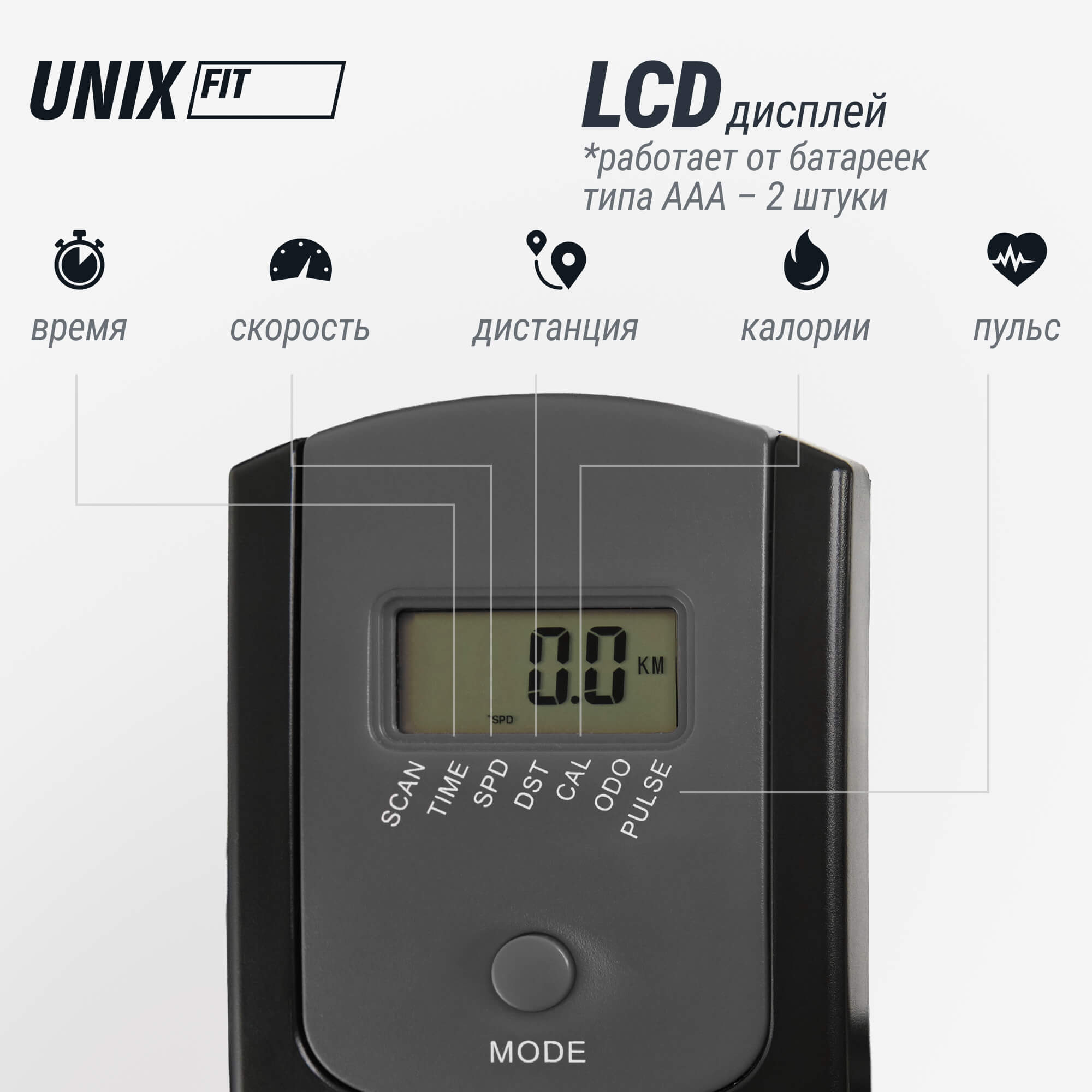 - LCD-дисплей. Тренажёр оснащен LCD-дисплеем, который отображает информацию об основных показателях тренировки: время, расстояние, пульс, калории, скорость. Это поможет отслеживать свой прогресс и мотивировать себя на дальнейшие достижения. Со специальной подставкой для телефона или планшета вы сможете наслаждаться любимым сериалом во время домашней кардио тренировки или не пропустить важный звонок.