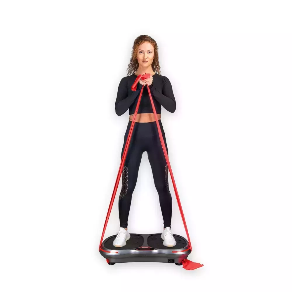 Зафиксировав эластичную фитнес-ленту на креплениях по бокам виброплатформы, можно создать дополнительную нагрузку на мышцы рук и проработать как можно больше зон.