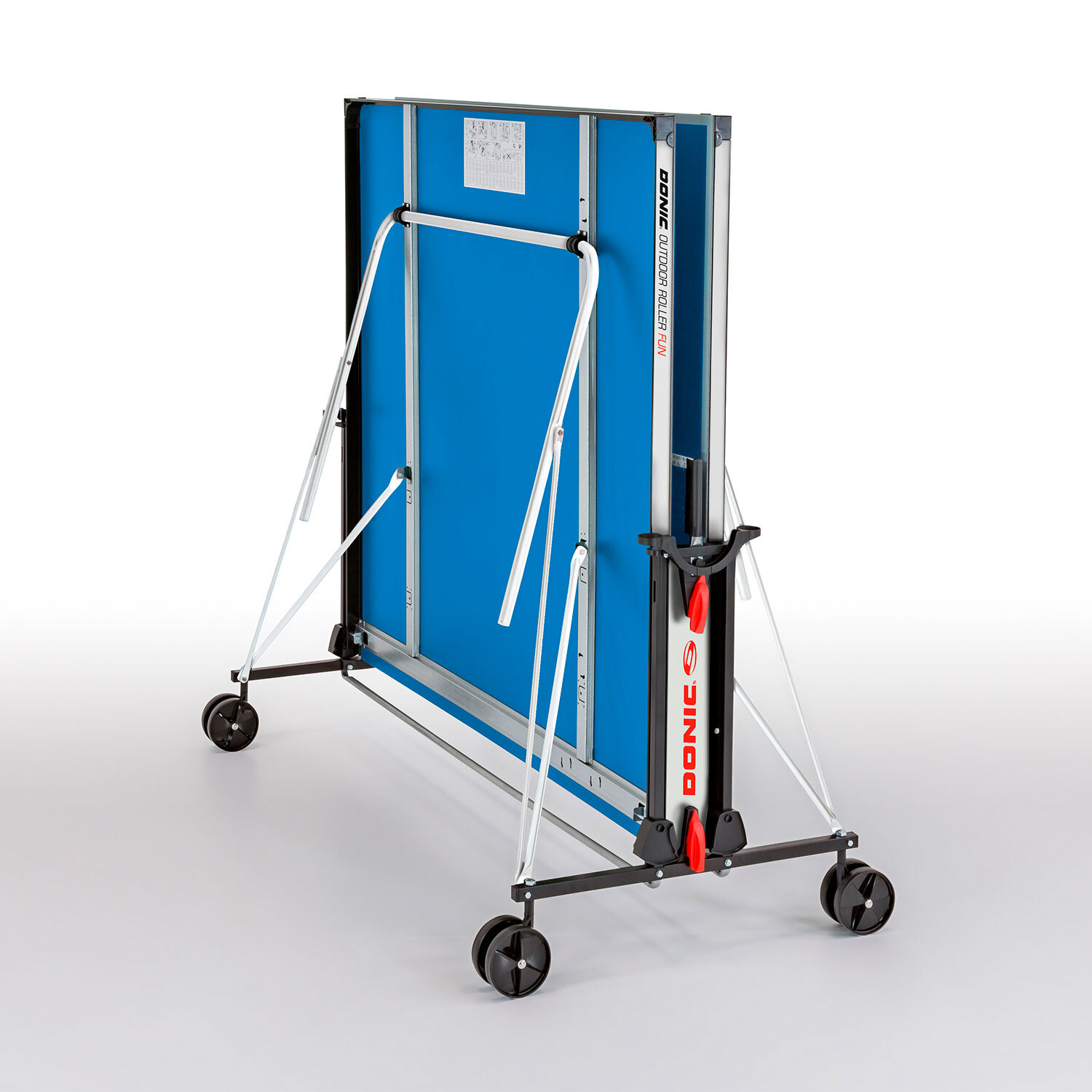 Обратите внимание на систему складывания. Во-первых, стол собирается за пару минут, причем это под силу одному человеку. Во-вторых, есть возможность играть в одиночку (вторая столешница ставится перпендикулярно к земле). При любом положении столешница блокируется, что исключает травмы при сборке. Транспортировочные колеса O128мм облегчают перемещение стола. Вес без оборудования – 47кг.